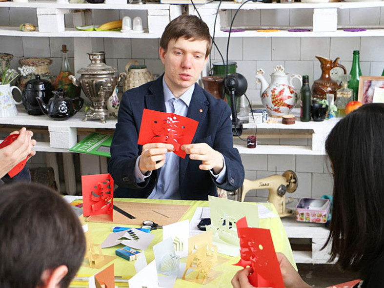 Обычно всё происходит в подготовленном помещении со столами. Приходят участники, я выдаю им распечатки шаблонов. Для начала я выбираю относительно простые шаблоны, и под моим руководством они начинают их вырезать, а затем складывать.